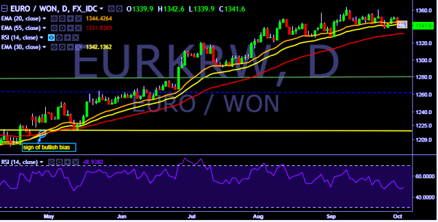 We prefer to take short position on EUR/KRW only below 1,339, stop loss at 1,349 and target of 1,326.