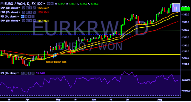 We prefer to take long position on EUR/KRW around 1,334, stop loss at 1,330 and target of 1,349.
