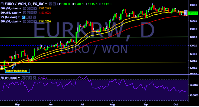 We prefer to take long position on EUR/KRW only above 1,340, stop loss at 1,332 and target of 1,352.