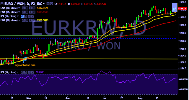 We prefer to take long position on EUR/KRW only above 1,349, stop loss at 1,338 and target of 1,356/1,363/1,377.