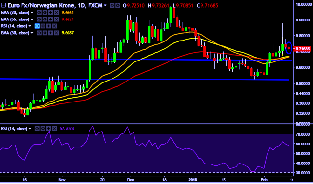 - Important to note here that 20D, 30D and 55D EMA heads down and confirms the bearish trend in a daily chart. We prefer to take short position on EUR/NOK around 9.7200, stop loss at 9.7466 and target of 9.6876.