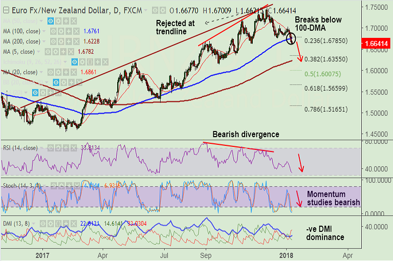 - EUR/NZD has broken below 100-DMA support at 1.6756, intraday bias lower.