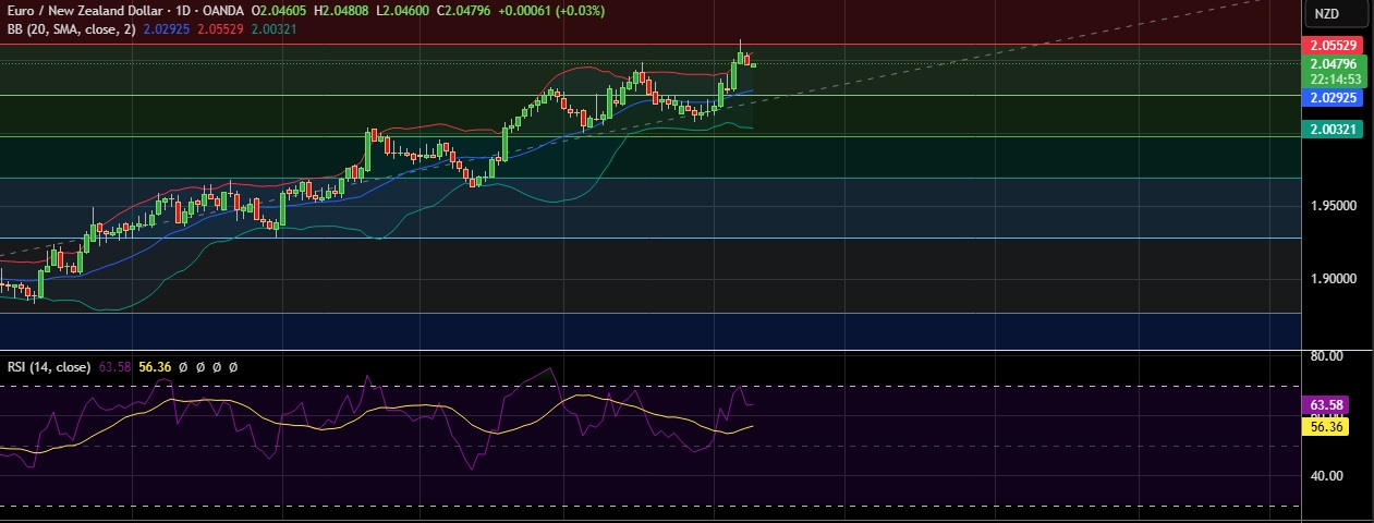 • Immediate resistance is located at 2.0568 (Higher BB), any close above will push the pair towards 2.0614(Higher BB).