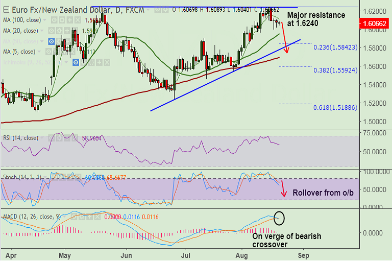 - EUR/NZD trades a narrow range, capped below 5-DMA at 1.6112.