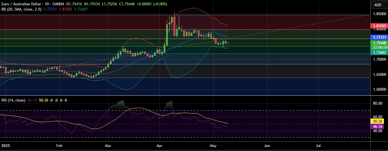 • Support is seen at 1.7432(50% fib) and break below could take the pair towards 1.7361 (Lower BB )