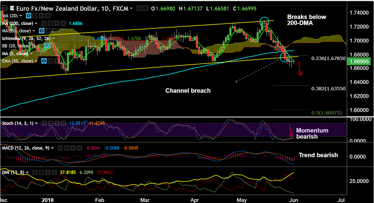 - The pair is extending consolidation after breach at channel base support, bearish technical indicators keep scope for further downside.