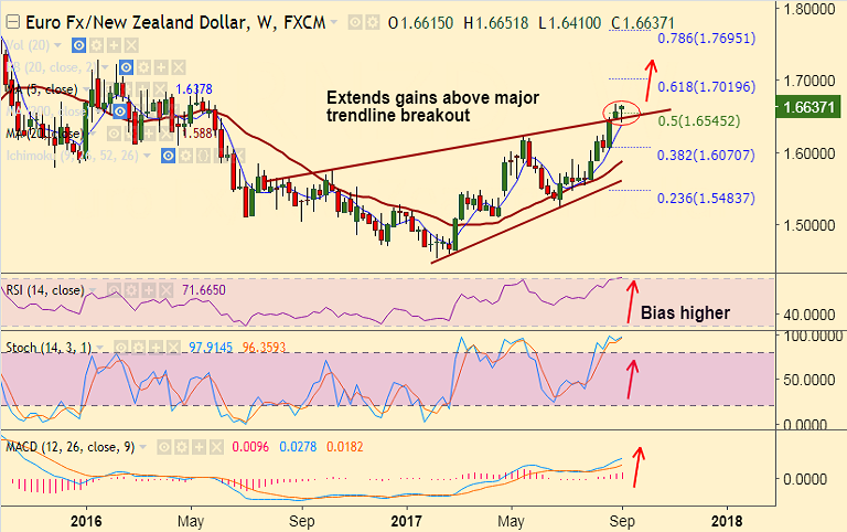 - EUR/NZD is extending break above major trendline resistance at 1.6240, further upside likely.