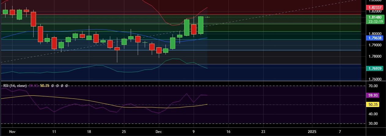 • Immediate resistance is located at 1.8157(23.6%fib), any close above will push the pair towards 1.8191 (Higher BB).