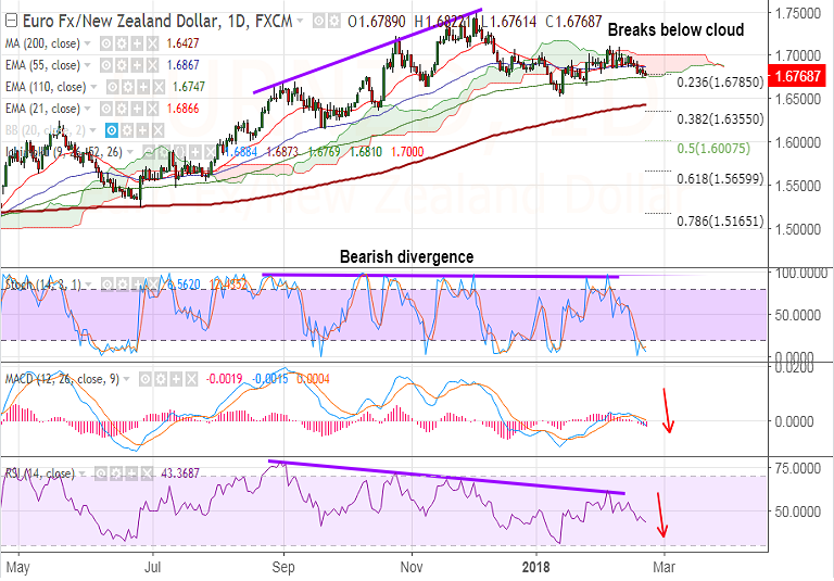 - EUR/NZD extends weakness below daily cloud, trades 0.11% lower on the day.