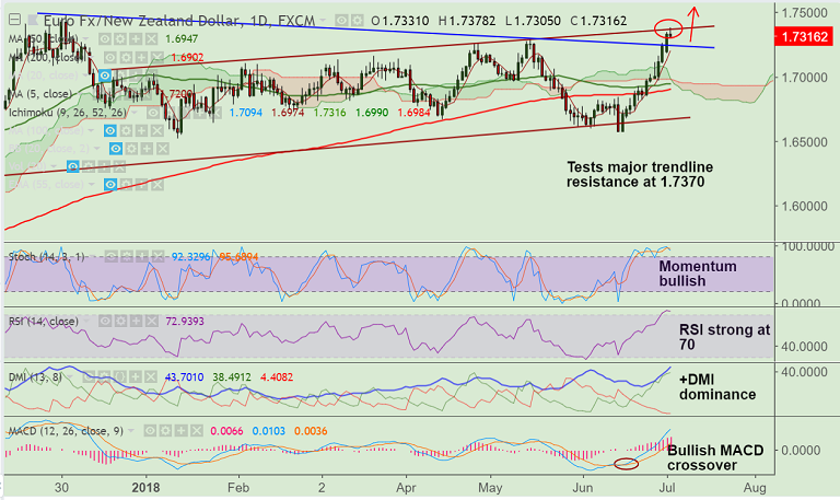 - EUR/NZD hits fresh 2018 highs at 1.7378 before paring some gains to currently trade at 1.7313 levels.