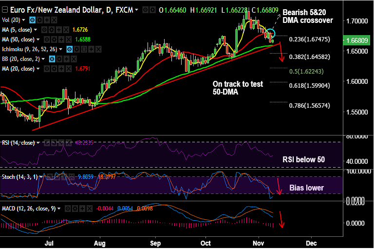 - EUR/NZD has hit fresh 3-week lows at 1.6622, intraday bias lower.