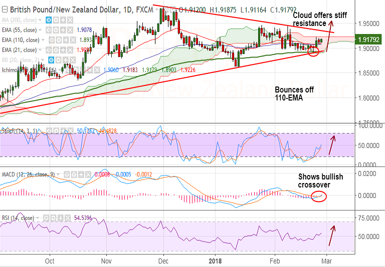 - Price action has taken support at daily cloud base and 110-EMA and edged higher.