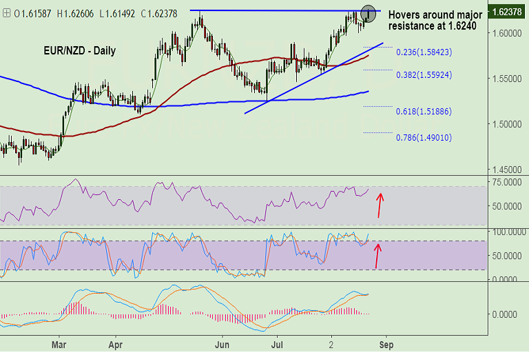 - The pair resumed upside after brief correction and is currently hovering around major trendline resistance at 1.6240.