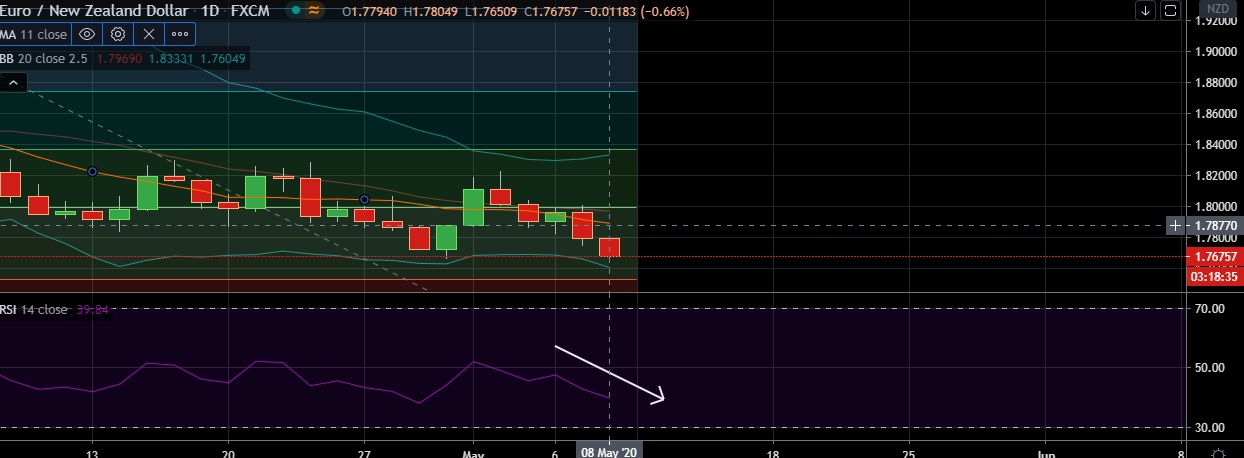 • Strong support is seen at 1.7598 (lower bollinger band) and break below could take the pair towards 1.7529 (23.6% fib).