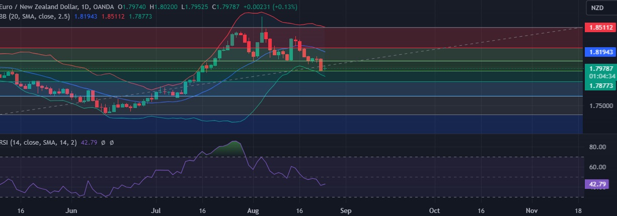• Support is seen at 1.7940(50%fib) and break below could take the pair towards 1.7884 (Lower BB)