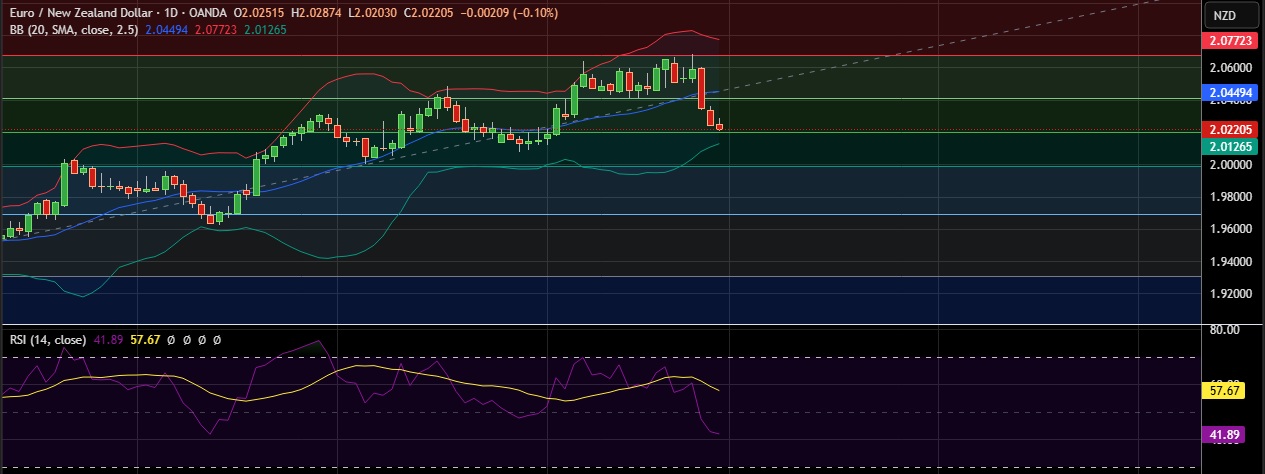 • Immediate support is seen at 2.0193 (50%fib) and break below could take the pair towards 2.0125(Lower BB).