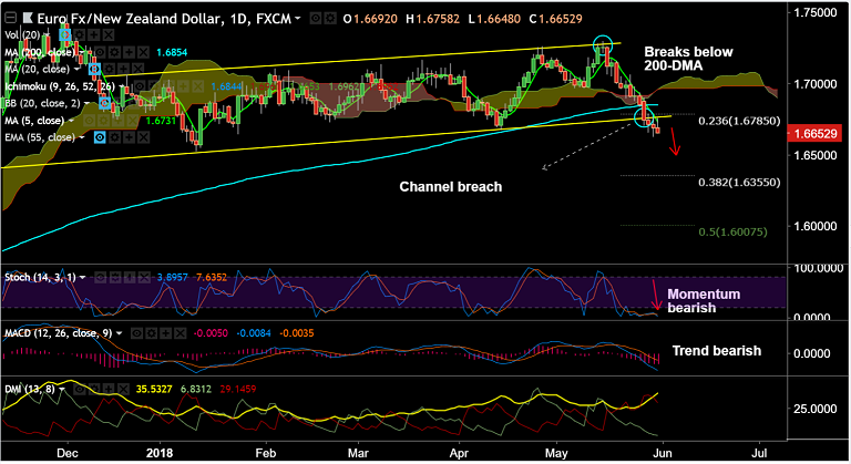 - The pair is extending weakness after breach at channel base support, scope for further downside.