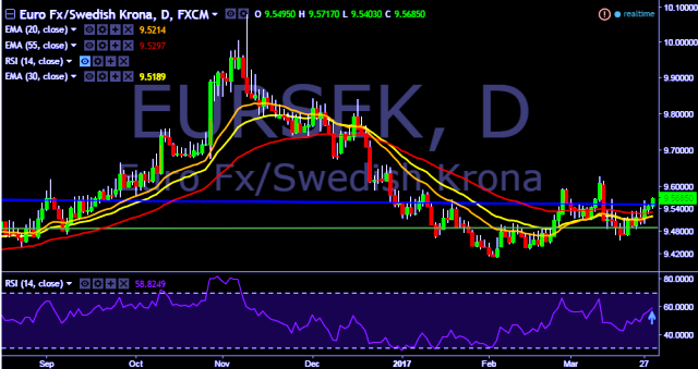 We prefer to take long position in EUR/SEK around 9.5680, stop loss 9.5263 and target of 9.6175.