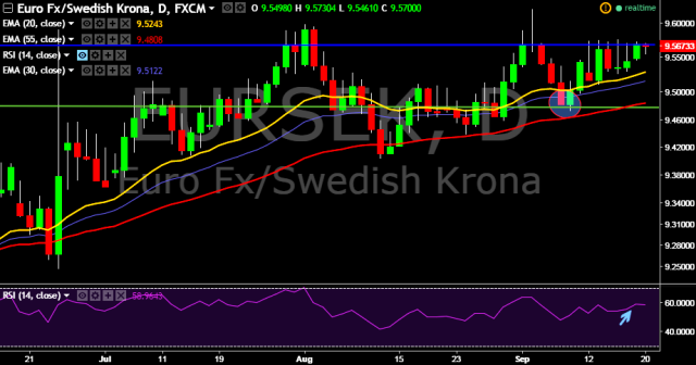 We prefer to go long on EUR/SEK only above 9.5713, stop loss at 9.5461 and target of 9.5922/9.5993.
