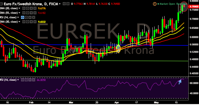 We prefer to take long position in EUR/SEK only above 9.7816, stop loss 9.7293 and target of 9.8295.