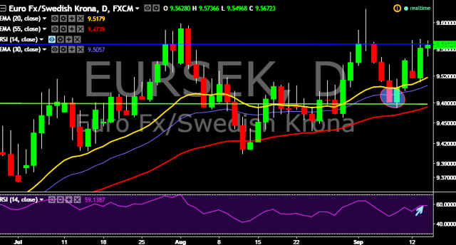 We prefer to go long on EUR/SEK only above 9.5681, stop loss at 9.5410 and target of 9.5993.