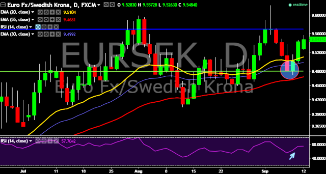 We prefer to go long on EUR/SEK around 9.56, stop loss at 9.5379 and target of 9.5713/9.5993.