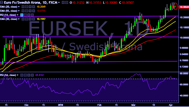 We prefer to take long position in EUR/SEK only above 10.3155, stop loss 10.2728 and target 10.3556.
