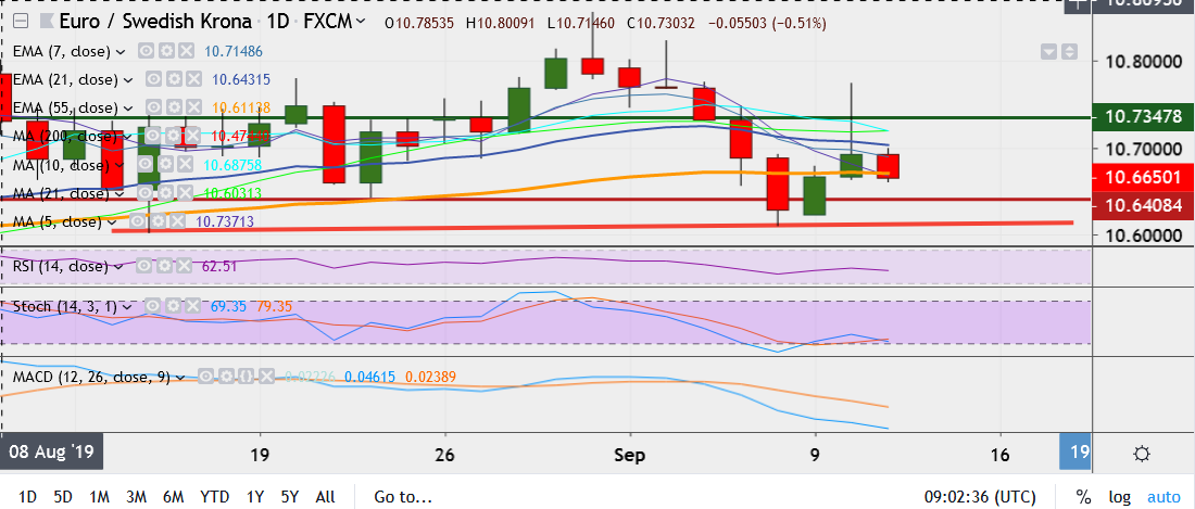 - EUR/SEK trades 0.3 percent down at 10.6630, having hit a high of 10.7739 on Tuesday, its highest since September 4.
