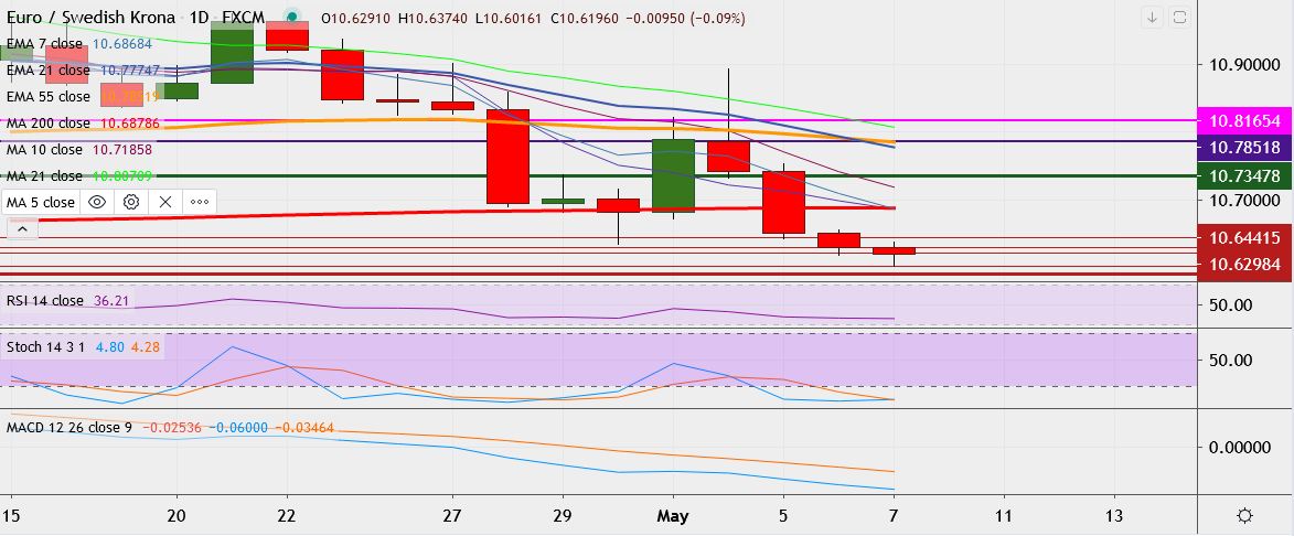 - EUR/SEK trades 0.1 percent down at 10.61882, having hit a low of 10.6016 earlier, its lowest since March 6.