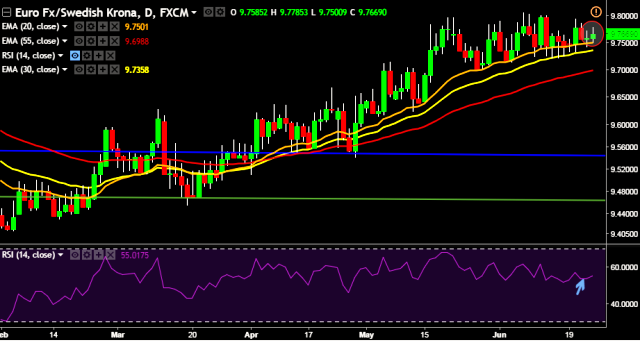 We prefer to take long position in EUR/SEK around 9.7680, stop loss 9.7424 and target of 9.8008.