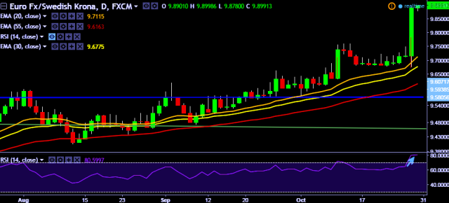 We prefer to go long on EUR/SEK around 9.89 with stop loss at 9.8501 and target of 9.9402/9.9690.
