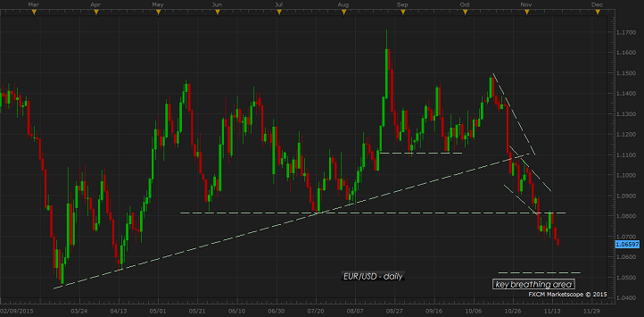 Euro has been declining steadily against Dollar, since European Central bank hinted that it might expand its stimulus program in December. Euro dropped more than 700 points since ECB meeting, only taking small breather at 1.10, 1.09 and 1.07, against popular expectations of a halt at 1.08.