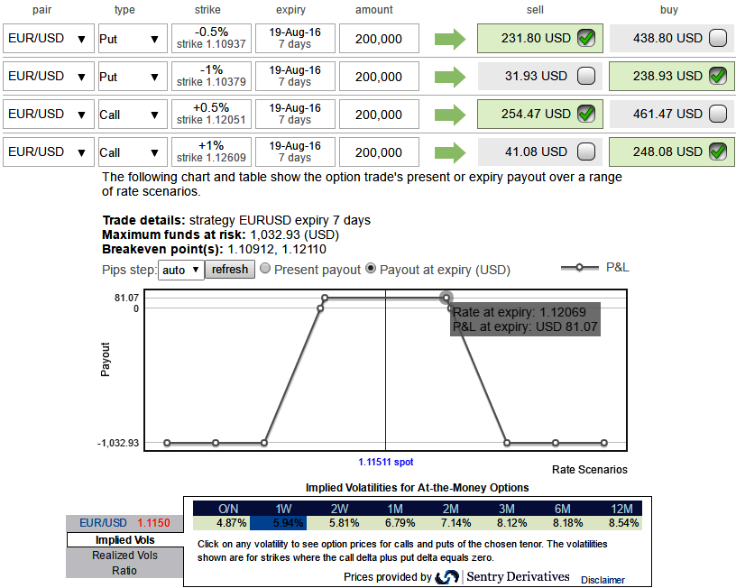 Since the EURUSD's implied volatility is perceived to be comparatively minimal from other major G7 pairs and neutral risk reversal sentiments, speculators in this range are on competitive advantage, accordingly, we construct a multiple leg of option strategy for regular traders of this currency cross when there is little IV. A total of 4 legs are involved in the condor options strategy and a net debit is required to establish the position.