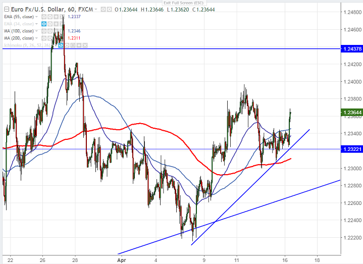 - EUR/USD has pared some of its gains in today’s European session and jumped almost 45 pips from the intraday low of 1.23240. The pair declined sharply in previous week high on account of more dovish ECB minutes meeting. It hits high of 1.23686 and is currently trading around 1.23635.