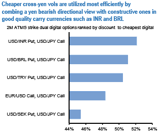 As a pair trade, USDJPY 1M ATMs vs. 1M 25D EUR puts/USD calls (delta-hedged) are favorably priced 1.0 –1.5 pts. below recently realized vols.
