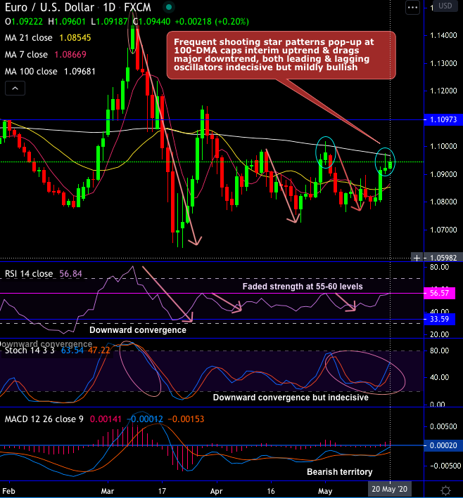 EURUSD has attempted for recovery rallies several times in the recent time past, but frequent shooting star patterns pop-up at 100-DMA to cap the interim uptrend and drag major downtrend.