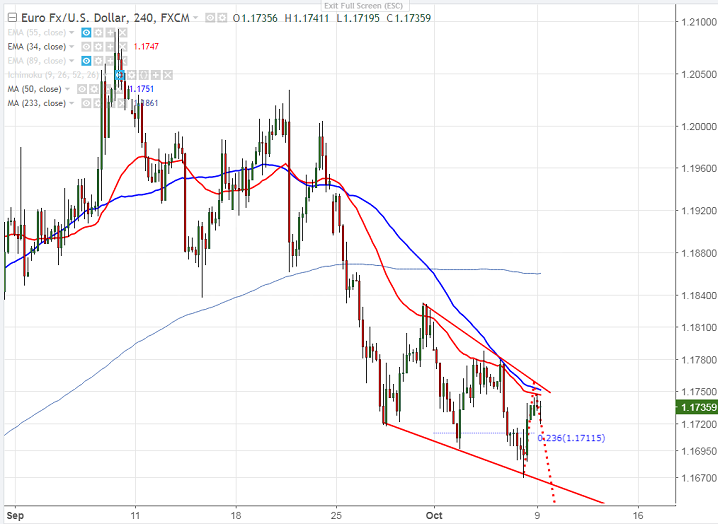 - EUR/USD has low of 1.16695 after better than expected U.S jobs data. US economy lost 33000 jobs compared to forecast of increase of 90000 jobs. But slightly better than expected age growth will boost inflation which is slightly positive for USD. The fresh worries over tensions in North Korea preparing to test long range missile has made Euro to increase slightly till 1.17476. It is currently trading around 1.17351.