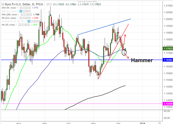 - Technically, the pair has closed slightly above 50- day MA on Friday. The pair is facing near term resistance at 1.1814 (20- day MA) and any break above will take the pair till 1.18765 (61.8% retracement)/1.1900/1.19612 (Nov 27th 2017 high).
