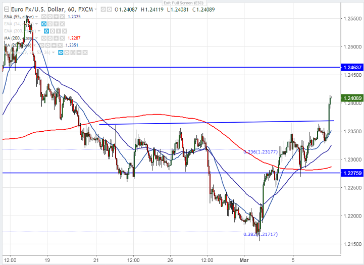 - EUR/USD was trading quiet in European session after hitting high of 1.23649 on Friday. Euro gained sharply almost 0.58% in the U.S session. The pair was in consolidation mode yesterday after Eurozone data such as services PMI, retail sales and consumer confidence misses estimate.