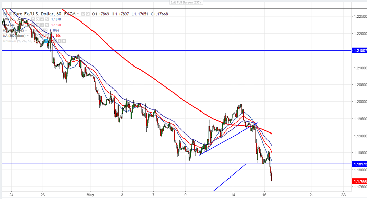- EURUSD continuing its weakness for 3rd consecutive day and broken major support 1.1800. the pair hits fresh 2018 low at 1.17950 at the time of writing. The pair weakness was mainly due to rising US 10 year bond yield. The yields hits fresh 4 year high at 3.09% yesterday. The new government formed in Italy by populist parties also supporting Euro selling. US retail sales data came slightly weaker than expected at 0.3% compared to forecast of 0.5%. It is currently trading around 1.17681.
