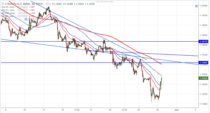 - EUR/USD pared its early loss after hitting 10 –month low of 1.1510. The pair jumped almost more than 120 pips till 1.16400 at the time of writing. German retail seas and unemployment came better than expected. German retail sales came at 1.2% m/m and 2.3 y/y in April compared to forecast and geramn unemployment rate dropped to 5.2%. But rising Italy bond yield and political uncertainty in Spain will cap the upside move of Euro. Markets eye US ADP employment data which is to be released today for further direction. It is currently trading around 1.16385.