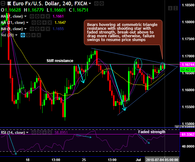 Minor trend oscillates between symmetric triangle sides. The bears are hovering at symmetric triangle resistance with shooting star with faded strength (refer 1H chart), the stiff resistance is observed at 1.1675 levels. Any break-out above likely to drag more rallies, otherwise, any failure swings to resume price slumps again..