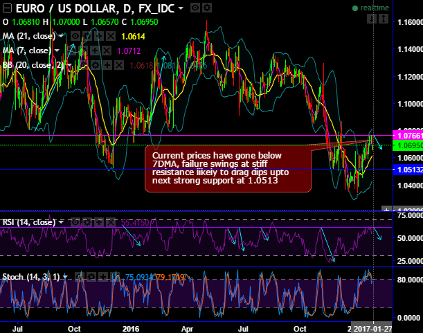 Current prices have gone below 7DMA, failure swings at stiff resistance likely to drag dips up to next strong support at 1.0513.