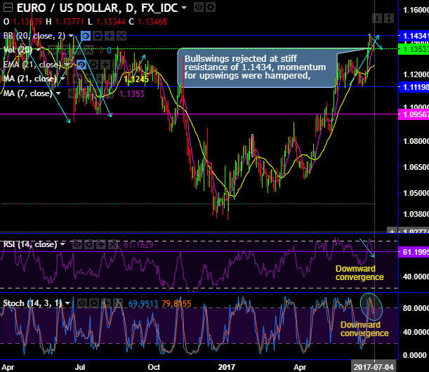 Upswings were rejected below stiff resistance at 1.1434 levels, current prices slid below 7SMAs, more slumps likely as momentum turns bearish.