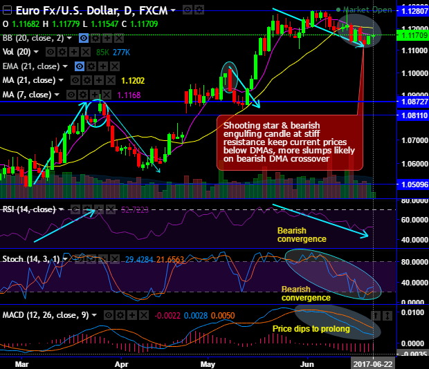 Shooting star & bearish engulfing candles were traced out 1.1217 and 1.1147 levels at stiff resistance keep current prices below DMAs, more slumps likely on bearish DMA crossover.