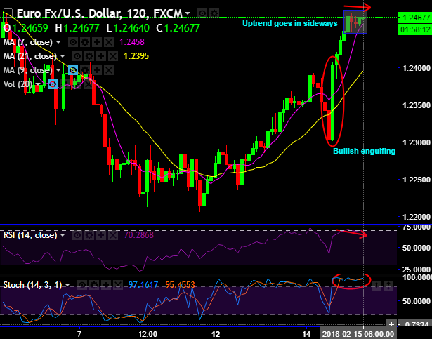 Although the minor trend of EURUSD manages to bounce back above 7 & 21SMAs (refer 2H chart), the current prices have been lingering in sideways. In this process, bullish engulfing pattern candle has occurred at 1.2403 levels, despite this bullish pattern leading oscillators to signal overbought pressures.