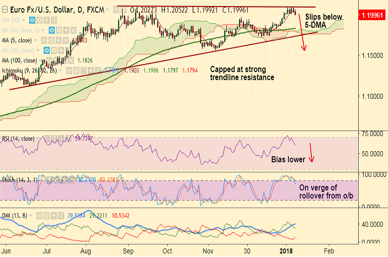 - The major has breached 5-DMA support at 1.2033 and is currently trading 0.25% lower at the time of writing.