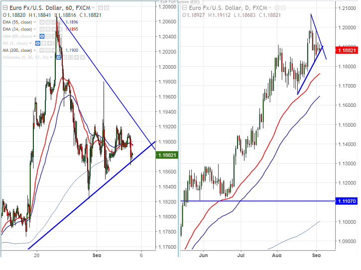 - EUR/USD declined once again after showing a minor jump till 1.19221 yesterday. The pair is waiting for ECB meeting which is to be held on Sep 7th for further direction. It is currently trading around 1.18795.
