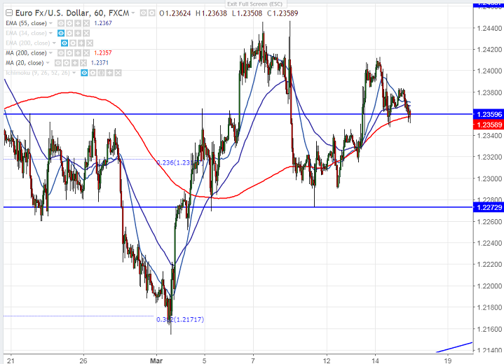 - EUR/USD is trading in narrow range between 1.22731 and 1.24118 for the past four trading session. The pair hits low of 1.23472 yesterday. It is currently trading around 1.23580.