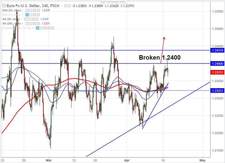 - EUR/USD has pared some of its gains in today’s European session after weak German ZEW sentiment data. The pair declined sharply almost 50 pips from the intraday high of 1.24137. It hits low of 1.23648 and is currently trading around 1.23761.